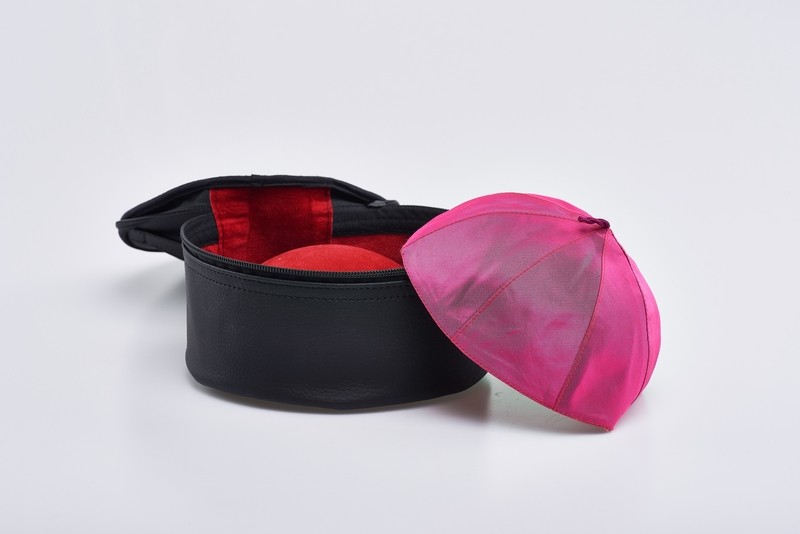 Custodia per zucchetto, chiusura a zip - rivestito interamente in floccato rosso, con manico - misura cm. 20x8