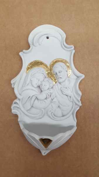 Acquasantiera Sacra Famiglia in pregiato Biscuit di Porcellana con particolari oro - cm. 11x18 (in scatola regalo)
