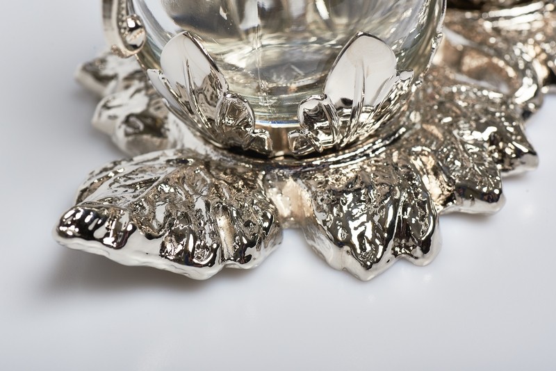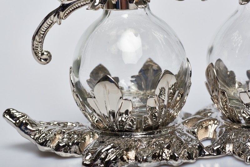 Servizio di ampolline "Vesuvio" con vassoio fusione nikel , vetro 100 cc. vassoio cm.22x11,5.
