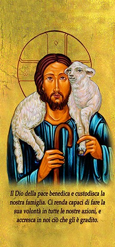 Cartoncino con immagine Gesù Buon Pastore con dettagli oro dicitura sul davanti: La Tua benedizione, o Signore discenda su questa famiglia e vi rimanga sempre nella salute, nella gioia e nella pace.