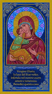 Immagine di Madonna con Bambino con dettagli oro e dicitura: Vergine Maria, la luce del tuo volto, infonda nel nostro cuore amore e tenerezza, benecici questa casa. In cartoncino con foro da appendere, sul retro Rito Benedizione della Famiglia (dal Messale Romano) - f.to 12x22