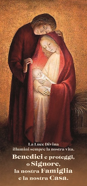 Immagine della Sacra famiglia con oro digitale: La luce Divina illumini semprela nostra vita. Benedici e proteggi o Signore, la nostra Famiglia e la nostra Casa. In cartoncino con foro da appendere, sul retro Rito Benedizione della Famiglia (dal Messale Romano) - f.to 10x22
