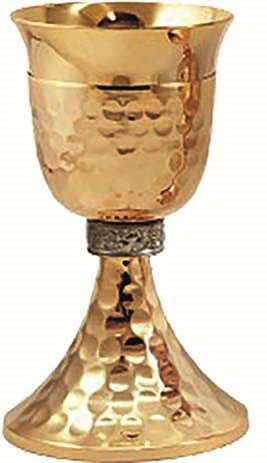 Calice in ottone dorato 24k , h.19 cm. ,con base e sottocoppa martellata e particolare nodo "Uve e Foglie di Vite"
