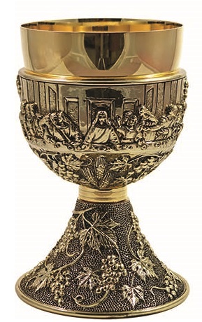 Calice in ottone dorato, base uva e foglie di vite, sottocoppa Ultim a Cena in rilievo, finitura oro antico - alt. cm.18