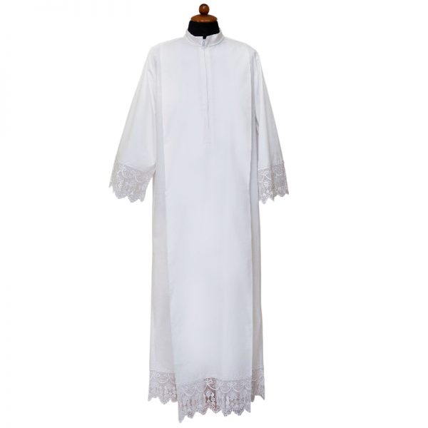 Camice con piegoni e cerniera sul davanti, arricchito sul fondo e sulle maniche da un raffinato merletto con croce e calice. cotone/poliestere 35/65 - color bianco