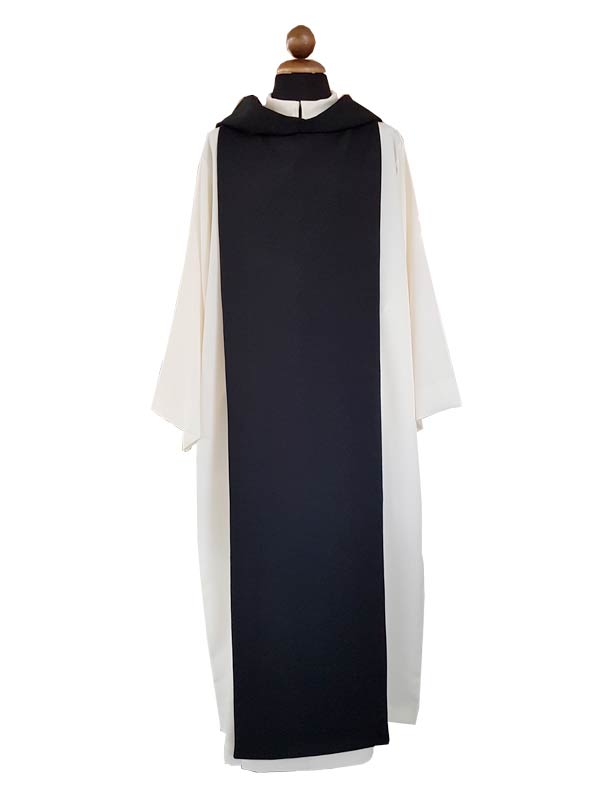 Camice Cistercense, confezionato in tessuto vaticano poliestere 100%, composto da camice con due piegoni colore avorio e scapolare con cappuccio nero