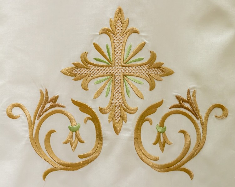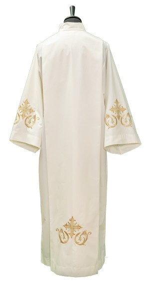 Camice in misto cotone (cotone 65%-poliestere35%) con piegoni e cerniera sulla spalla con ricamo Croce sul fondo e sulle maniche.