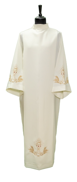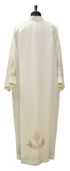 Camice in tessuto vatican poliestere 100% con piegoni e cerniera sulla spalla con ricamo Calice e spighe sul fondo e sulle maniche.