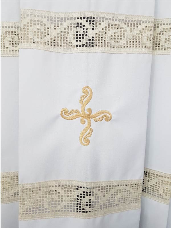 Camice con piegoni e cerniera sulla spalla, arricchito da doppio giro tramezzo e croce ricamata sul fondo e sulle maniche.