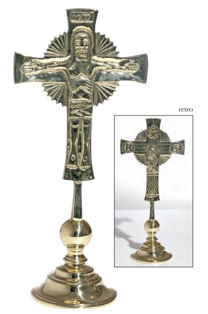 Croce Neocatecumenale da tavolo con base, realizzata in ottone fuso con finitura oro, altezza cm. 27
