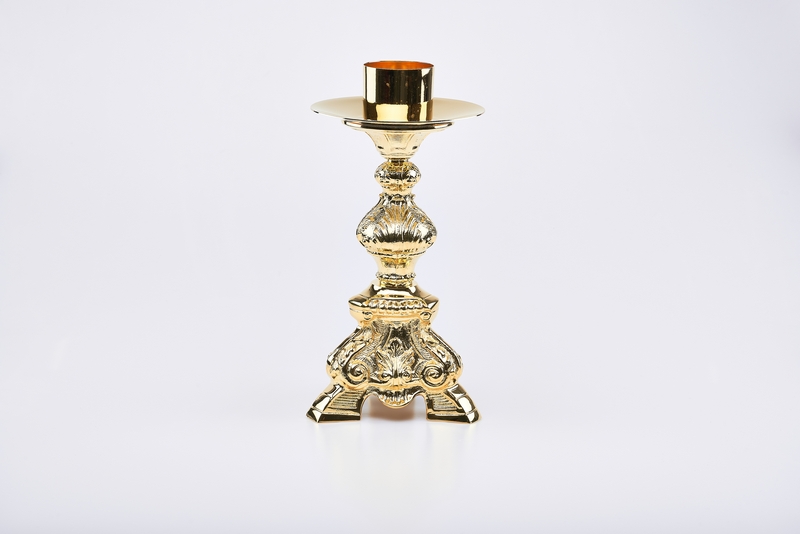 Candeliere Barocco ricco da mensa alto cm.31 con bossolo diametro cm. 6.Questi candelieri sono forniti dorati (o nikelati senza sovrapprezzo) .( A richiesta questo prodotto puo' essere elettrificato).