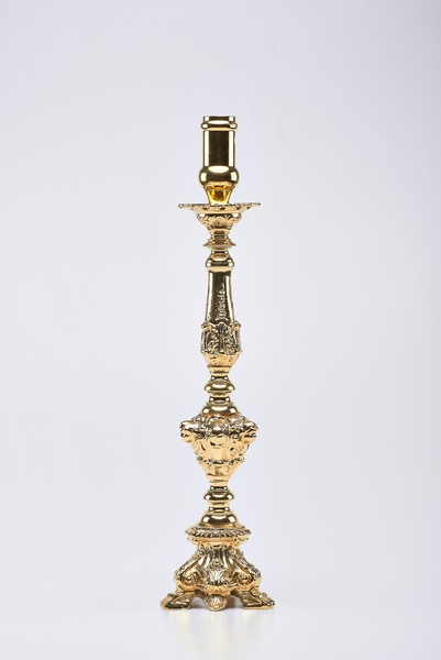 Candeliere "Barocco" ricco, altezza cm.40- misura bossolo cm.2,5 . Questi candelieri sono normalmente forniti in ottone lucidato, possono essere dorati o nikelati con un sovrapprezzo del 15% .( A richiesta questo prodotto puo' essere elettrificato).