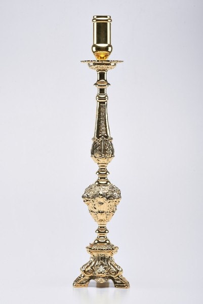 Candeliere "Barocco" ricco, altezza cm.50 - misura bossolo cm.3,2. Questi candelieri sono normalmente forniti in ottone lucidato, possono essere dorati o nikelati con un sovrapprezzo del 15%( A richiesta questo prodotto puo' essere elettrificato).