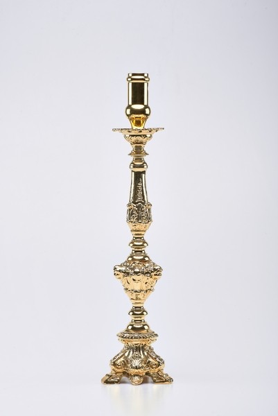Candeliere "Barocco" ricco, altezza cm.80 - misura bossolo cm.5. Questi candelieri sono normalmente forniti in ottone lucidato, possono essere dorati o nikelati con un sovrapprezzo del 15%( A richiesta questo prodotto puo' essere elettrificato).
