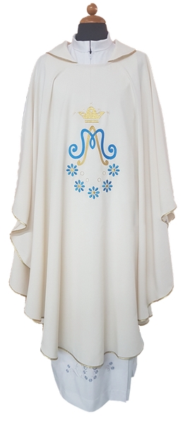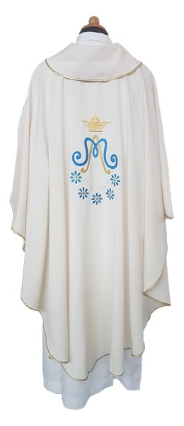 Elegante casula confezionata in tessuto vaticano super leggero (poliestere 100%), con un raffinato ricamo mariano presente sul davanti e sul retro.