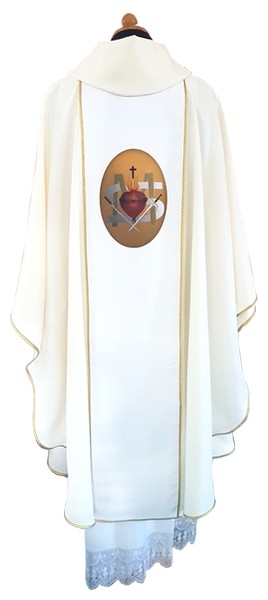 Elegante Casula Mariana con stampa sul davanti e sul retro, confezionata in tessuto vaticano poliestere.