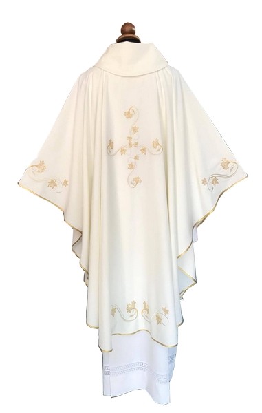 Casula in tela vaticana misto lana (lana 20%viscosa 40%poliestere 40%) con ricami laterali e croce centrale.