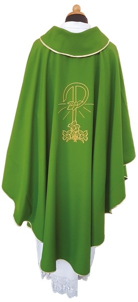 Casula confezionata in tessuto vaticano (poliestere 100%), con ricamo pace-gigli presente sul davanti e sul retro.