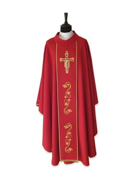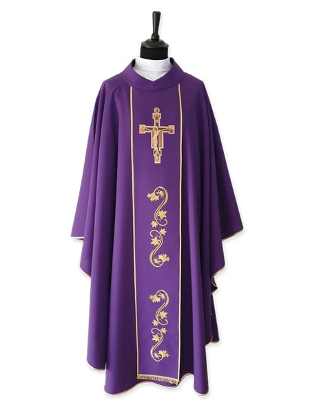 Casula con stolone ricamato e con icona della croce di San Francesco stampata sul davanti, sul retro simbolo dell'ordine francescano stampato.