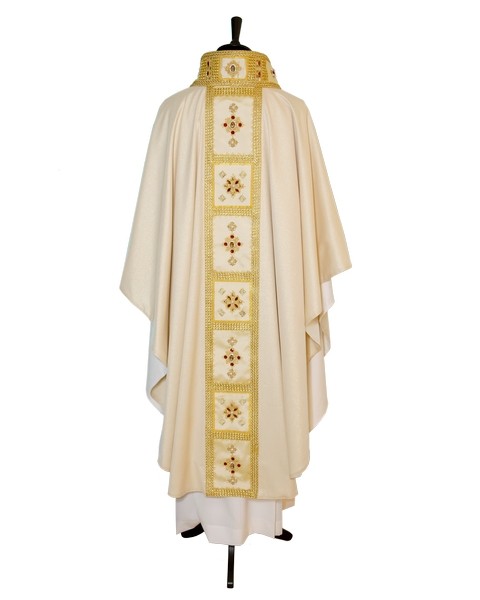 Solenne casula, realizzata interamente a mano, arricchita con perle e con pietre luminose e brillanti.Confezionata in pregiato tessuto sablè lurex di lana (poliestere 75%-lana 25%).