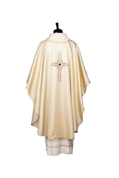 Casula in tessuto oro lurex, con ricamo croce davanti e dietro