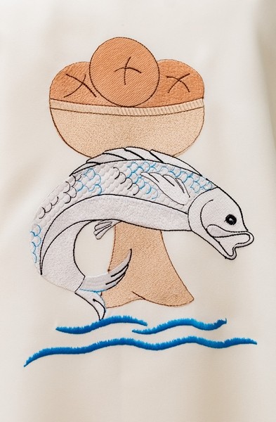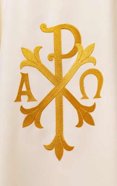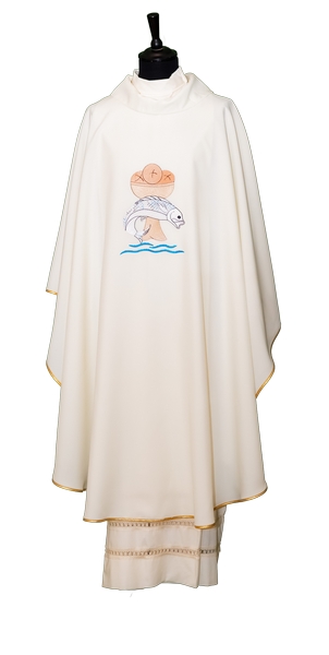 Casula confezionata in tessuto vaticano di poliestere, con simbolo pane e pesci sul fronte e ricamo Alfa e Omega sul retro.
