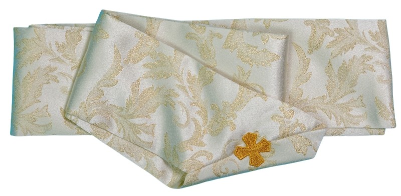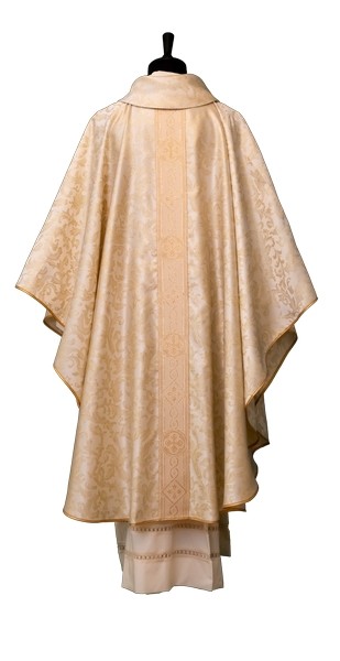 Casula confezionata in tessuto damascato lurex di poliestere, con delicato gallone fronte e retro.