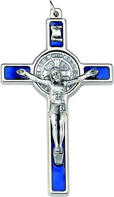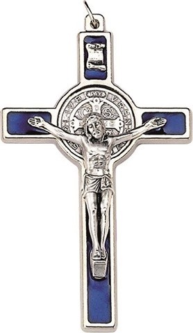 Croce metallo argentato smaltata S. Benedetto cm. 5 con laccio in scatoletta- colori smalto assortiti