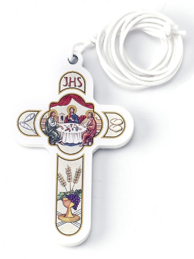 Croce in legno bianco e disegno a colori Ultima Cena con cordoncino cm. 7,3