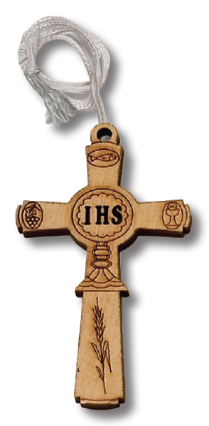 Croce in legno di ulivo con simboli incisi con cordoncino alt. cm. 9
