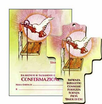 Diploma ricordo Confermazione con dettagli oro abbinato a croce in legno confezionato in busta trasparente - f.to cm. 10x14,8
