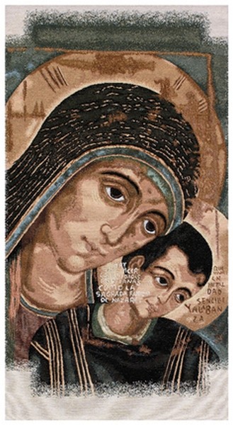 Copriambone arazzo con immagine Madonna di Kiko Icona in tessuto misto cotone, ricamato a telaio, dimensioni: cm. 50x230