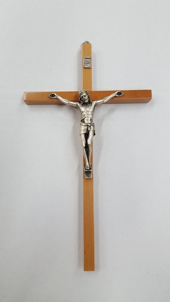 Croce in legno di faggio e ulivo con corpo in metallo argentato - cm. 24 (in scatola)
