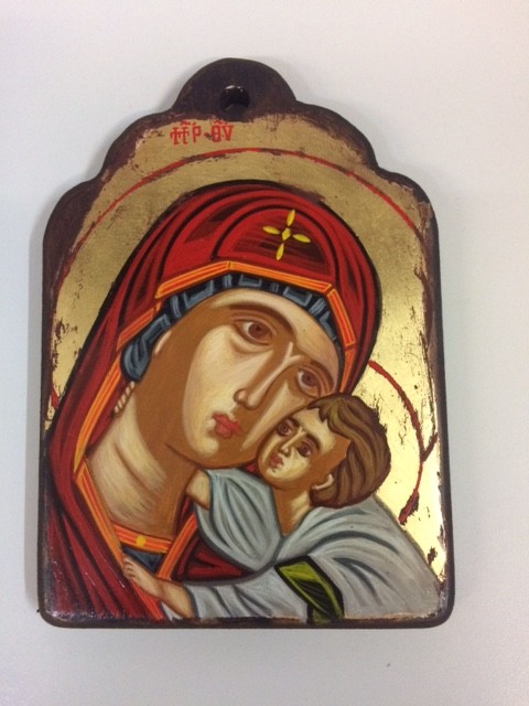 Icona greca dipinta a mano, Madonna con Bambino, realizzata su legno sagomato a cupola in formato cm. 13x18