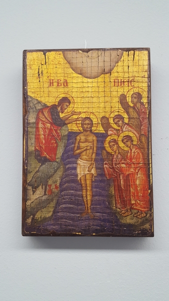 Icona serigrafata anticata "Battesimo di Gesù" cm.17x25 in scatola.