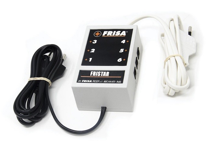 Alimentatore 6 uscite tremule, cinque con il temolio tipico delle stelle ed una con il tremolio tipico del fuoco. Le uscite per le stelle si accendono e spengono in dissolvenza e hanno un brillio alla massima luminosità, ad esse potranno essere collegati fasci di fibra ottica "microfo"/"maxifo". Dotato di una spina di alimentazione da collegare alla rete 230 Vac e una spina Start/Stop da collegare alla fase della centralina in cui si vuole che entri in funzione, questa spina potrà essere collegata indifferentemente su uscite fisse o in dissolvenza. Possibilità di raddoppiare le uscite mediante le prese doppie "PRL2.1"