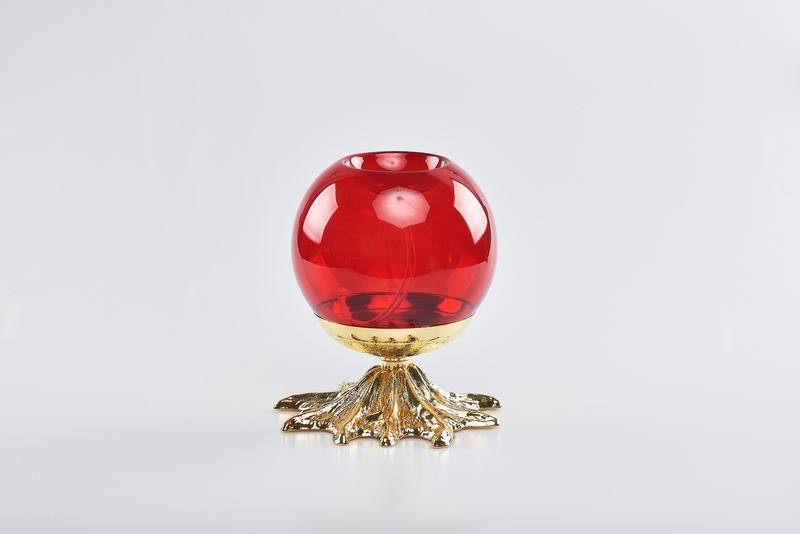 Lampada sfera in vetro rosso su base in elegante fusione artistica in bronzo dorato - diametro cm. 18 alt. cm. 21