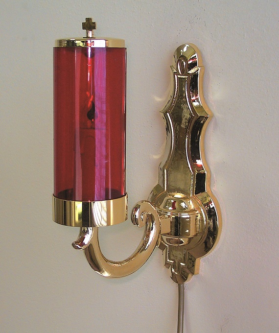 Supporto a muro in ottone con vetro rosso (8 giorni) e luce attacco elettrico 220V - altezza cm. 23 profondità cm. 16