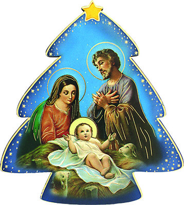 Quadretto a forma di alberello in legno, da appendere, con immagine della Natività (immagine finiture dorate) confezionato singolarmente in busta trasparente, ideale come regalino alle famiglie, bambini, ecc... - f.to cm. 8,5x9,5