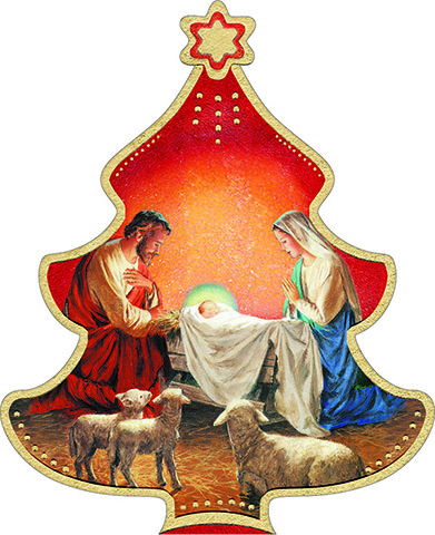 Quadretto a forma di alberello in legno, da appendere, con immagine della Natività (immagine finiture dorate) confezionato singolarmente in busta trasparente, ideale come regalino alle famiglie, bambini, ecc... - f.to cm. 8,5x10,5