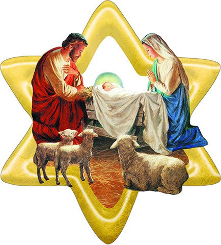 Quadretto a forma di stella in legno, da appendere, con immagine della Natività, sfondo traforato (immagine finiture dorate) confezionato singolarmente in busta trasparente, ideale come regalino alle famiglie, bambini, ecc... - f.to cm. 9,5x10,5