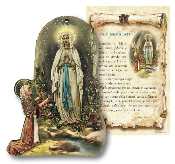 Tavoletta sagomata in legno Madonna di Lourdes cm. 8X11 con cartoncino "Preghiera degli ammalati" - in blister