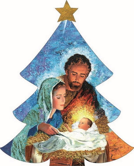 Quadretto a forma di alberello in legno, da appendere, con immagine della Natività (immagine finiture dorate) confezionato singolarmente in busta trasparente, ideale come regalino alle famiglie, bambini, ecc... - f.to cm. 8,5x10,5