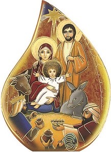 Quadretto con immagine Natività in legno a forma di fiammella (immagine finiture dorate) confezionato singolarmente in busta trasparente insieme ad un cartoncino colorato con preghiera natalizia sul retro, ideale come regalino alle famiglie, bambini, ecc... - f.to cm. 11x12,5