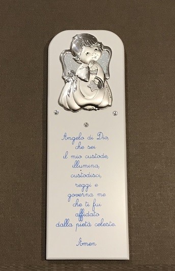 Quadretto da appendere o da appoggiare in legno con preghiera "Angelo di Dio" con immagine argentata in rilievo.