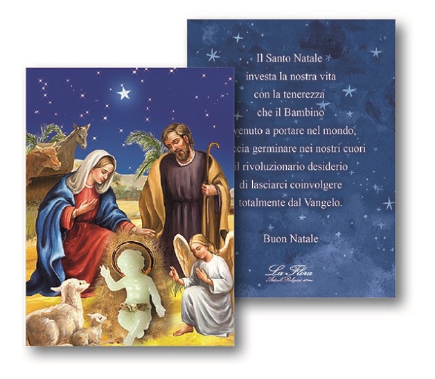 Confezione con Gesù Bambino in plastica fosforescente da cm. 4 su cartoncino preghiera (f.to 8x11)