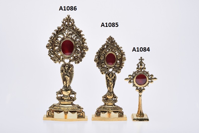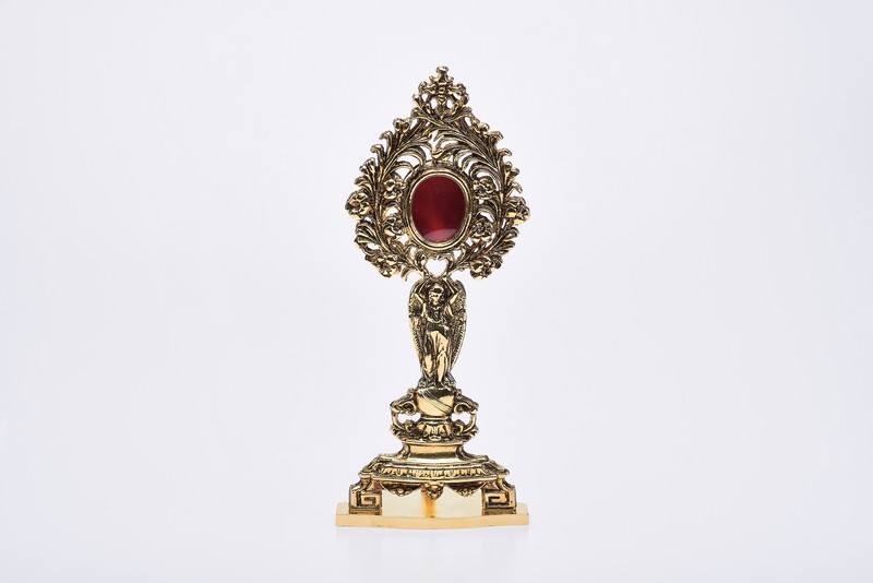 Reliquiario in bronzo dorato, alt.cm.32 x13,5 diametro della teca cm.5x6, interno floccato rosso, oblò in vetro.