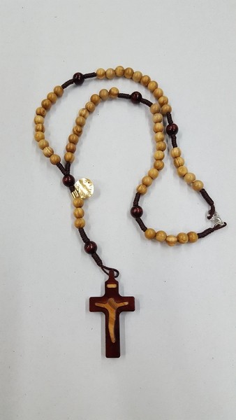 Rosario e croce stilizzata bicolore cm. 4,5 in legno d'ulivo legatura corda grano tondo liscio Ø mm. 6 con moschettone per poterlo indossare al collo,