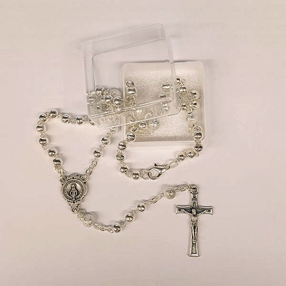 Rosario da collo in metallo argentato liscio grano mm.5 con cofanetto