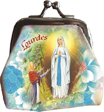 Borsellino in stoffa con immagine Madonna di Lourdes con rosario vetro (colori rosario assortiti)